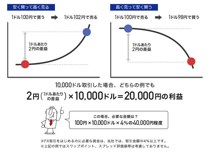 1ドル100円で買って、1ドル102円の時に売った場合も、1ドル100円で売って、1ドル98円で買った場合のどちらも2円の差益がでます。