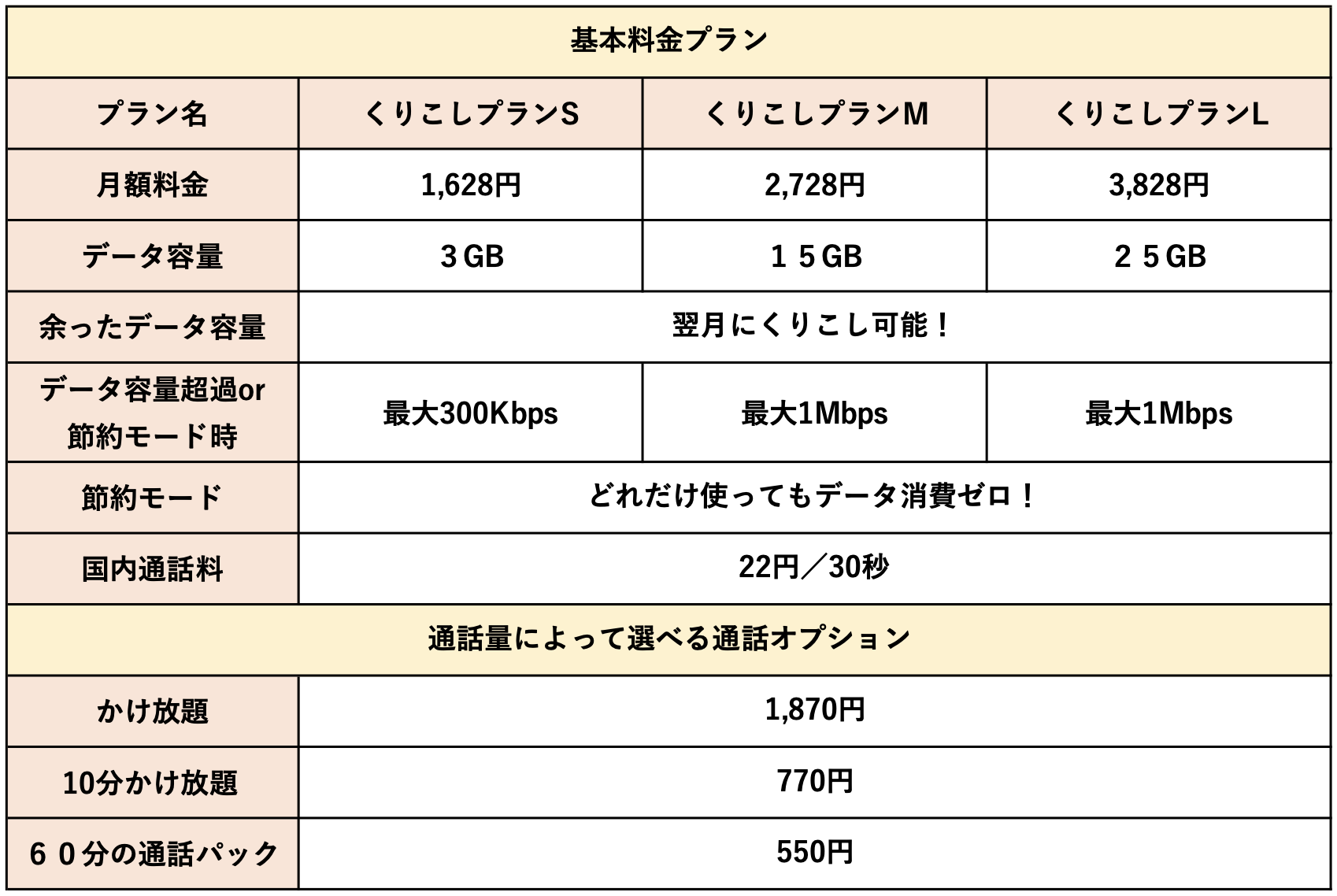もしご家族で使用量が少ない方2人がいれば、かけ放題なし+くりこしプランS(1,628円)で利用することができます。
